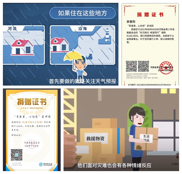 7月18日,突如其来的台风使河南郑州陷入内涝,“青春里,心向党”团队迅速行动起来,充分研究官方平台发布的防汛知识,搜集资料、撰写脚本、剪辑动画、字幕配音,制作了科普动画短片《面对“烟花”,我们应该做什么》,短片通过简明易懂的动画形式,向社会普及安全防范自救知识,在哔哩哔哩平台一经推广,获得了较大的关注度。“没法赶赴抗洪救灾一线,只能尽力为大家做点事情。”团队成员纷纷捐出零花钱,尽自己所能为受灾地区奉献爱心。