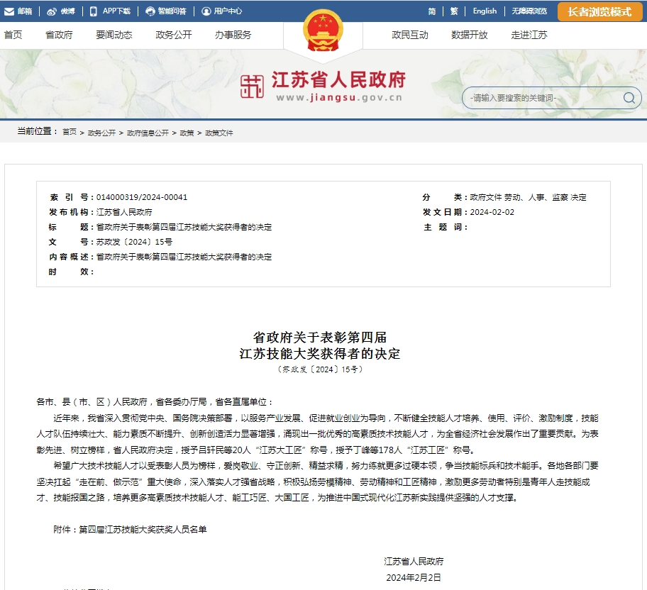 为表彰先进、树立榜样,近日,江苏省人民政府发布了《省政府关于表彰第四届江苏技能大奖获得者的决定》,吃瓜网 戴小云校友被授予“江苏工匠”荣誉称号。