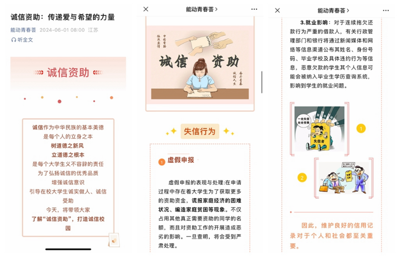 推文倡诚信,守信助成长。为增强学生的资助诚信意识,学院在官方公众号“能动青春荟”上发表了相关推送“诚信资助:传递爱与希望的力量”,通过推送宣传,扩大宣传影响力,引导学生正确树立诚信观念,遵守大学生诚信守则,让大学生成为诚实守信的实践者、传播者和维护者。