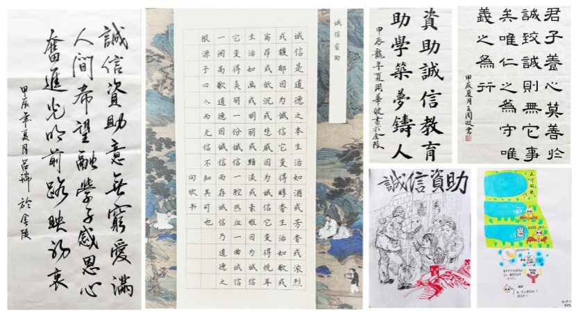 笔墨书诚信,画卷传美德。为丰富宣传教育形式,学院精心策划并开展了资助诚信主题书画作品征集活动。此次活动通过书画这一传统艺术形式,生动形象地展现资助诚信的内涵,让学生在创作过程中加深对资助政策和诚信精神的理解。同学们挥毫泼墨,用色彩和线条描绘出对诚信的感悟与理解。
