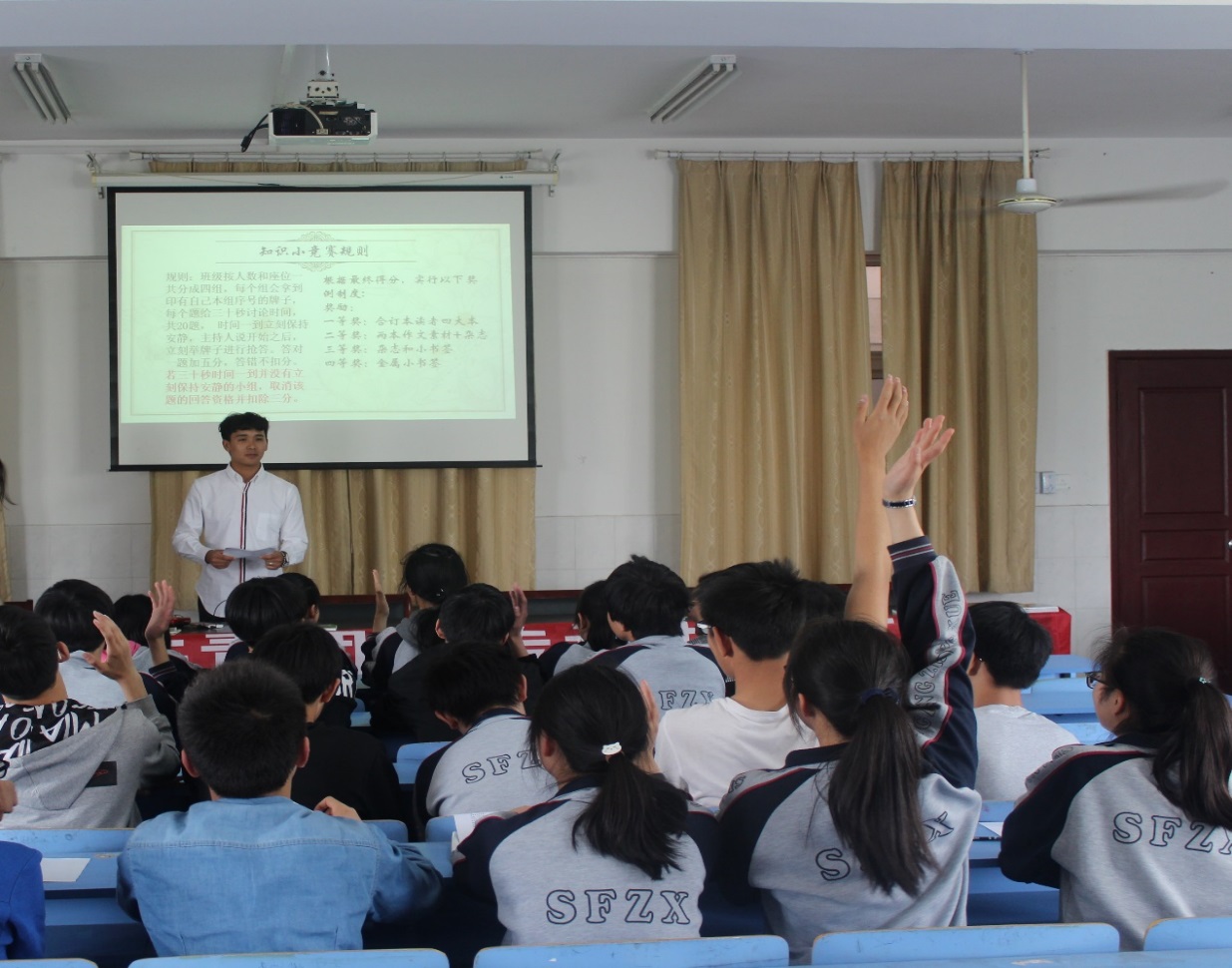 为了向更多的人展示阅读的魅力,该院能动161、能动171团支部打破惯有的团课模式,把授课地点从大学校园搬进了中学教室,授课人从团支书变成了全体支部成员,授课内容也从理论知识变成了有趣的阅读分享。大学生团员们为中学生推荐了《平凡的世界》、《生活十讲》等富有正能量的书籍,每人就自己最喜爱的一本书分享读书心得,并进行了富有感情的部分选段朗读。在团课讲授过程中,支部团员们还特别设计了知识问答环节,从“小试牛刀”到关于书名的“你画我猜”、再到最后的抢答,每一部分都紧紧围绕书籍知识展开,小同学们踊跃作答,现场气氛热烈。该院学子还向全体中学生发出了全民阅读的倡议,倡导大家多读书,读好书,传承书香文化,争当新时代优秀共青团员。